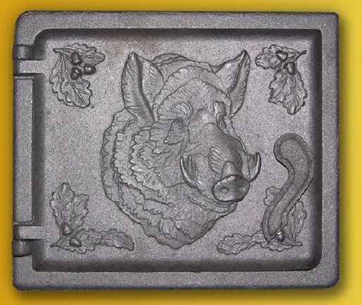 Топочная дверца предназначена для подачи дров в топку и изоляции пламени от помещения. Отлитая печная дверка может служить не просто по своему прямому функционалу, но и дополнять интерьер помещения особым шармом. Данная чугунная дверца украшена барельефным рисунком "Кабан", также обращает на себя внимание удлиненная ручка. Открывание дверки справа налево.
