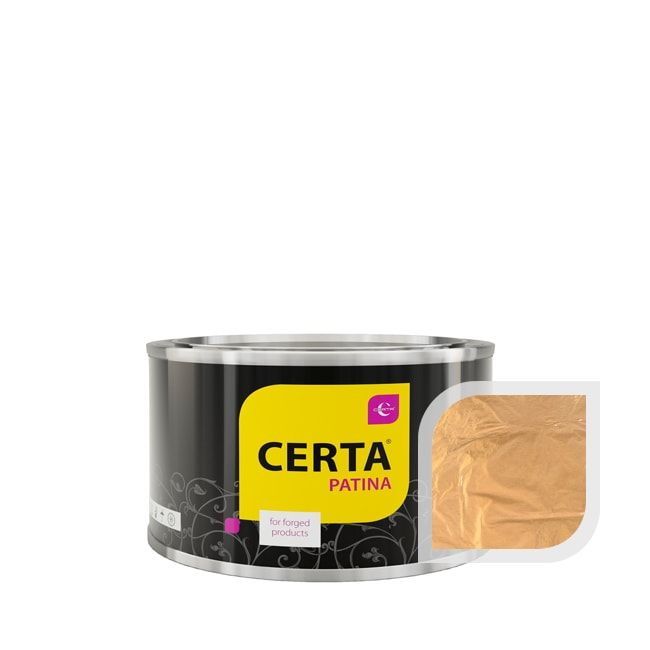 Термостойкая эмаль «Церта-Патина» придаёт кованым изделиям шикарные эффекты золочения, серебрения, вороненой стали, старой меди или чернения. Патиной легко выделить узор печи, виноградные гроздья на мангале или шишку на каминных принадлежностях. Покрытие выдержит нагрев до +700 °C.